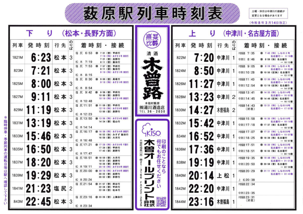◼︎時刻表(JR藪原駅時刻表(令和8年3月14日改正))