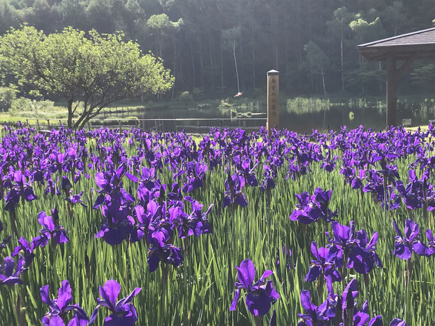 池の水面と東屋に重なるあやめの群生は、絵になります。