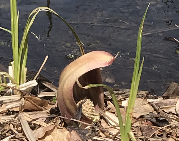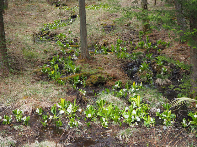 主に木陰の湿地帯に群生しています。一斉に咲くため見頃は一瞬ですが、木漏れ日の中、黄緑の大きな葉と白い花が映えてきれいです。